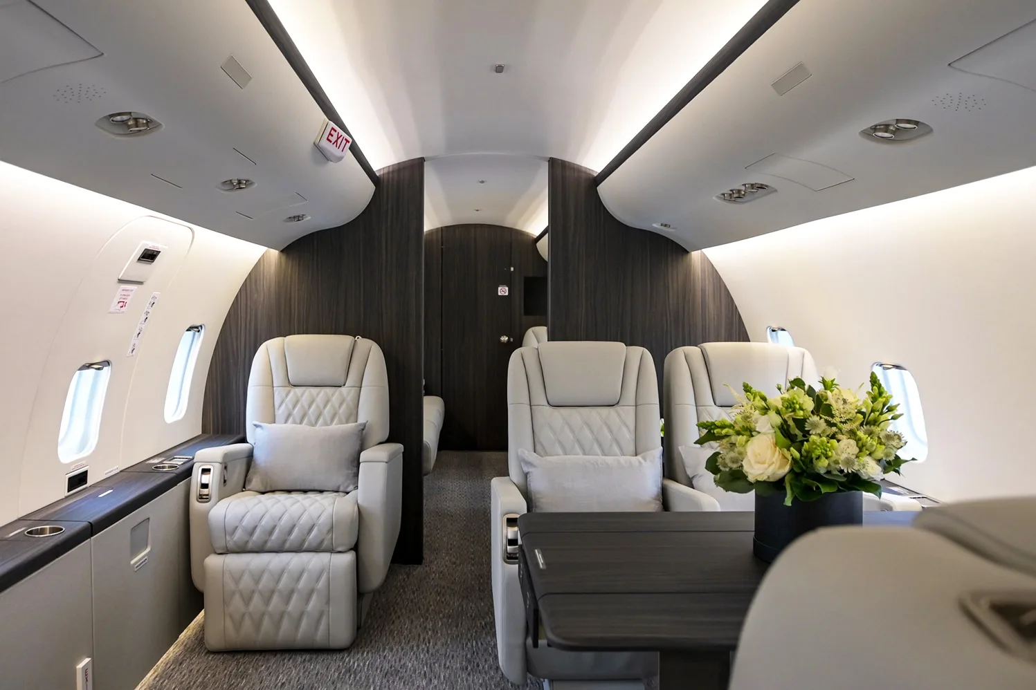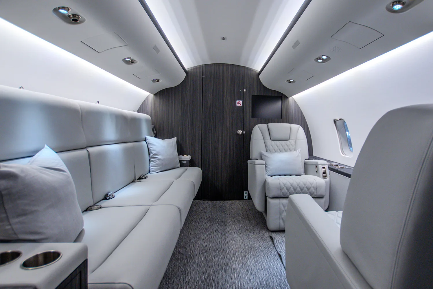 Our spacious cabin exemplifies the type of consistent, high-quality interior design that is to be expected with corporate general aviation. Inspired by a contemporary British aesthetic, 9H-JOY’s interior includes streamlined divans and seats upholstered in sumptuous light grey leather, as well as surfaces and a fully-equipped cabin adorned in high-end dark grey wood.