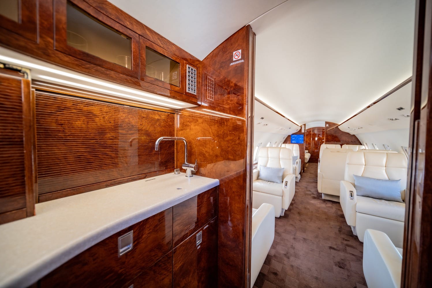 One of the main highlights of 9H-YOU is the vast corporate cabin, which has been furnished to an outstanding quality. Passengers can relax in stylish seats and divans upholstered with exquisite light grey leather and streamlined to reflect the cabin’s sleek, modern aesthetic – which is also evident in the skillful craftsmanship of the galley and surfaces.