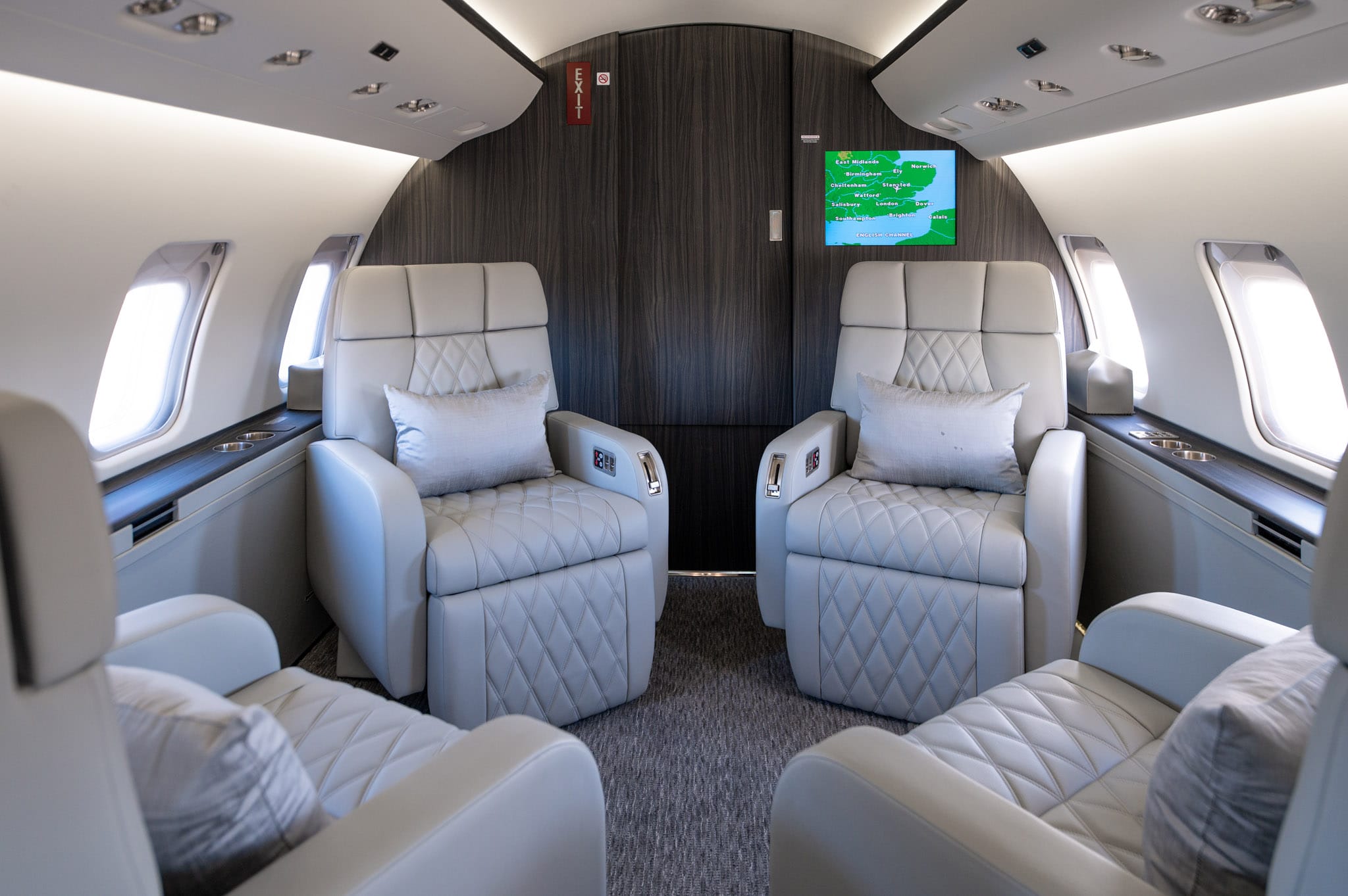 Our Challenger 850 private jets have been refurbished to epitomise high-end British style. The interior exudes timeless elegance and a bright contemporary finish. The plush seats and divans are upholstered in premium grey leather. This material recurs throughout the interior, offering a dynamic contrast with sleek dark grey wood surfaces.