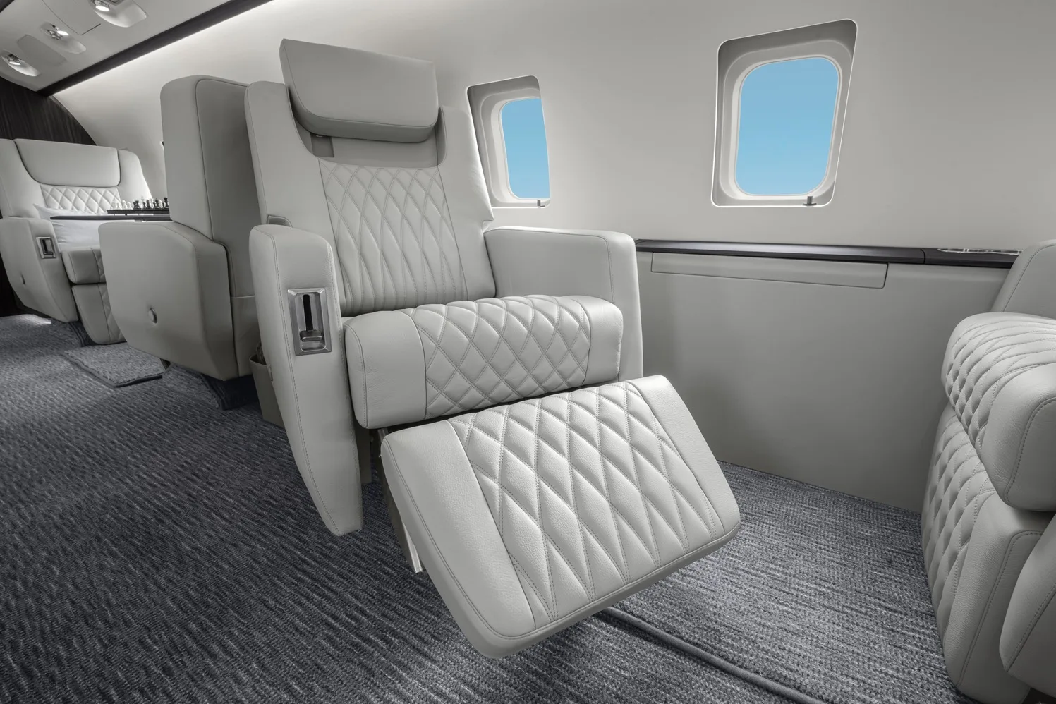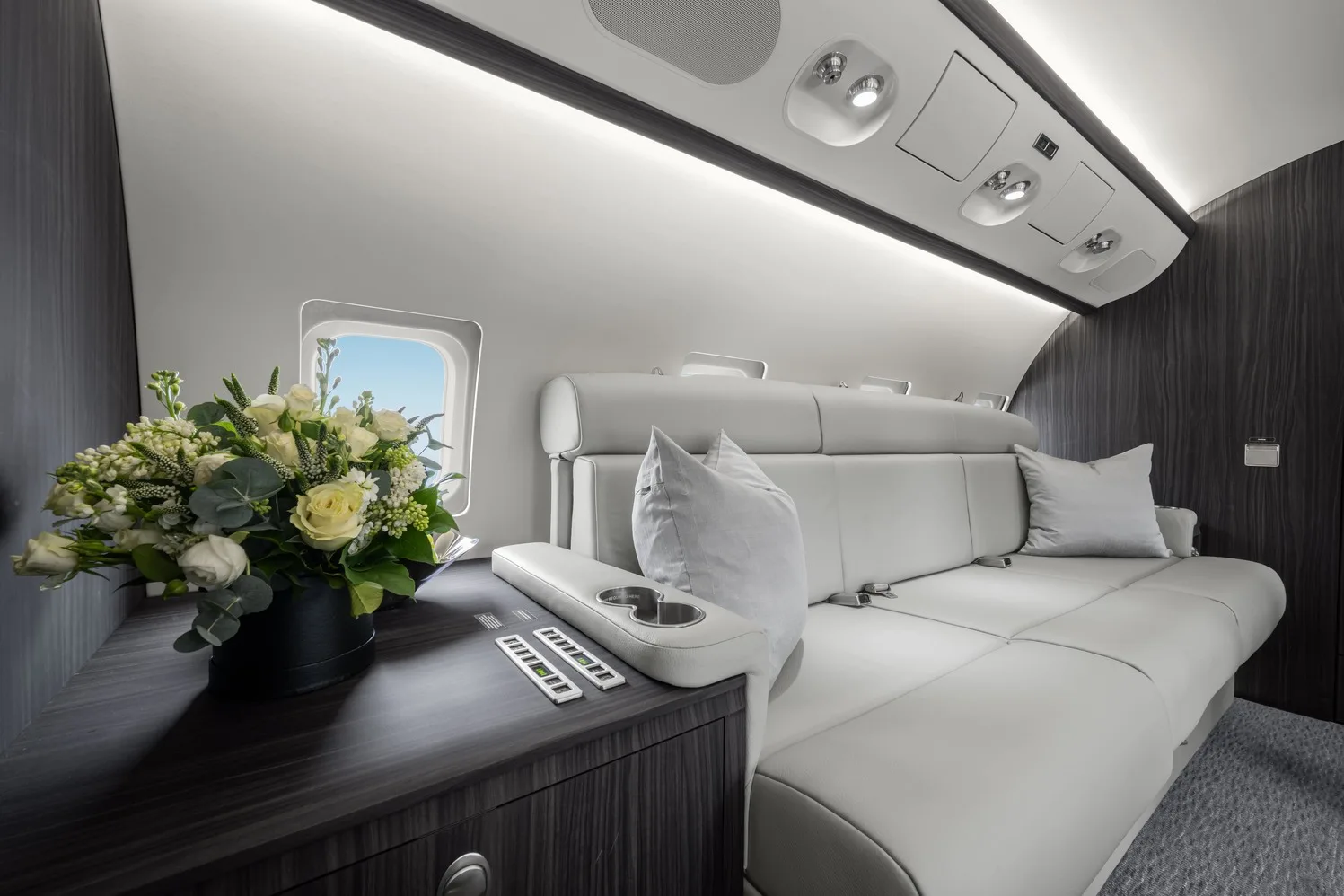 Our Challenger 850 private jets have been refurbished to epitomise high-end British style. The interior exudes timeless elegance and a bright contemporary finish. The plush seats and divans are upholstered in premium grey leather. This material recurs throughout the interior, offering a dynamic contrast with sleek dark grey wood surfaces.