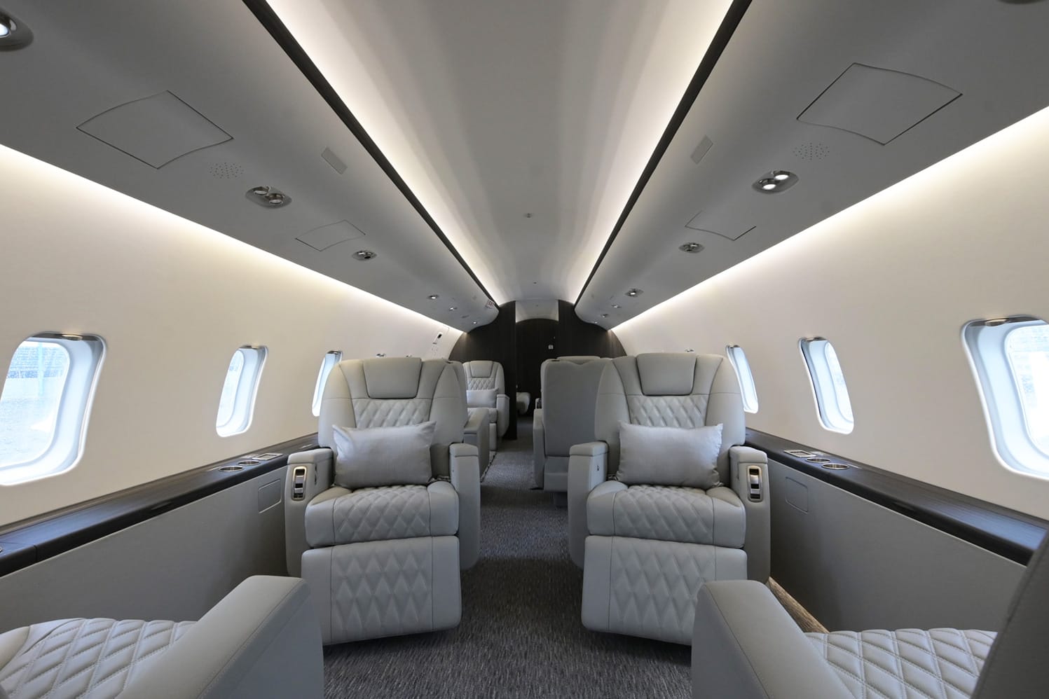 Our spacious cabin exemplifies the type of consistent, high-quality interior design that is to be expected with corporate general aviation. Inspired by a contemporary British aesthetic, 9H-JOY’s interior includes streamlined divans and seats upholstered in sumptuous light grey leather, as well as surfaces and a fully-equipped cabin adorned in high-end dark grey wood.